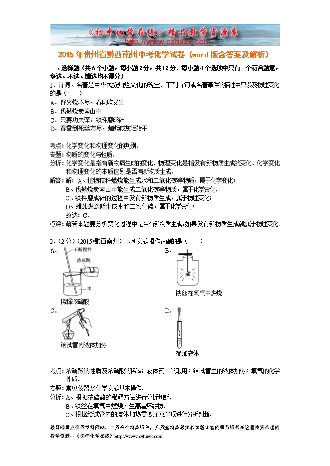 2015年贵州省黔西南州中考化学试卷(word版含答案及解析)