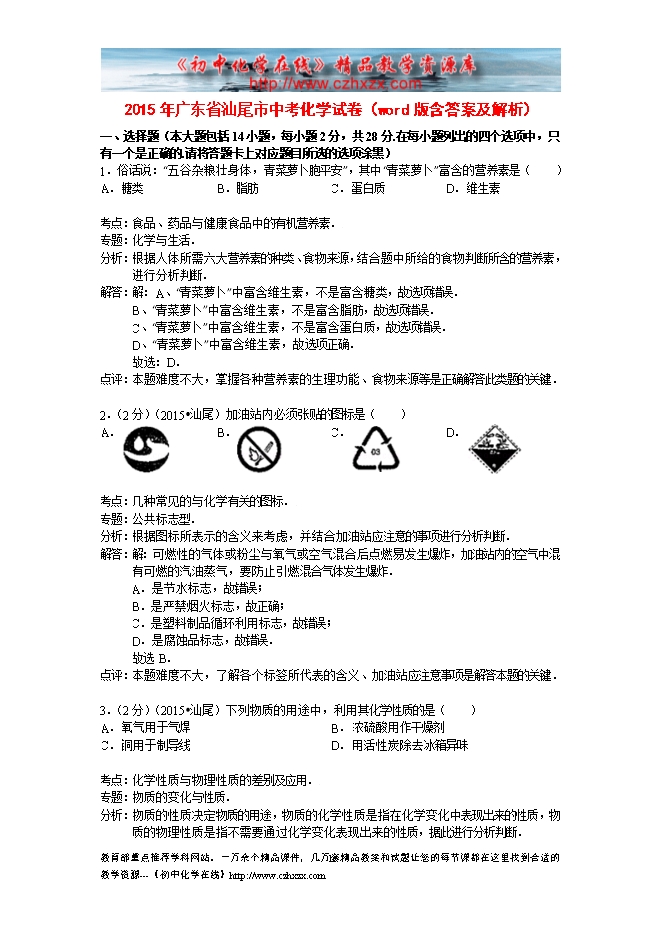 2015年广东省汕尾市中考化学试卷(word版含答案及解析)
