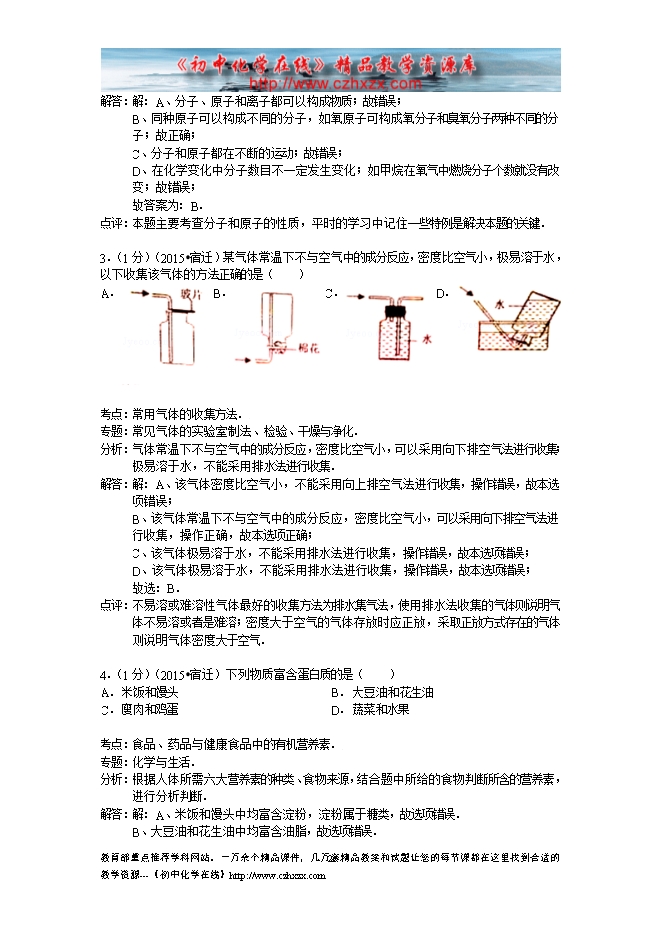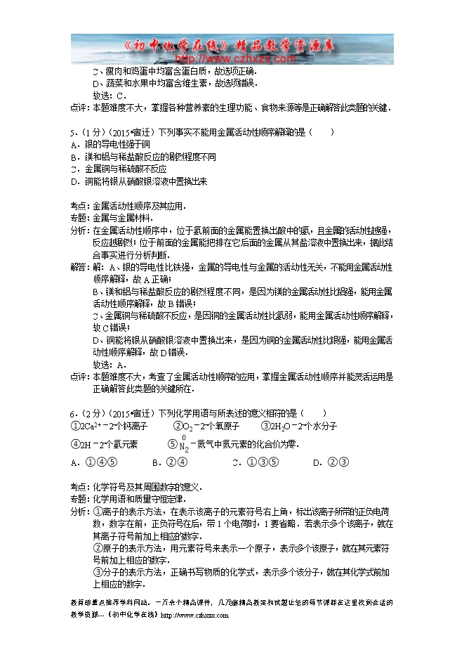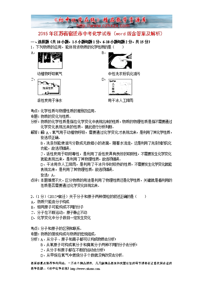 2015年江苏省宿迁市中考化学试卷(word版含答案及解析)