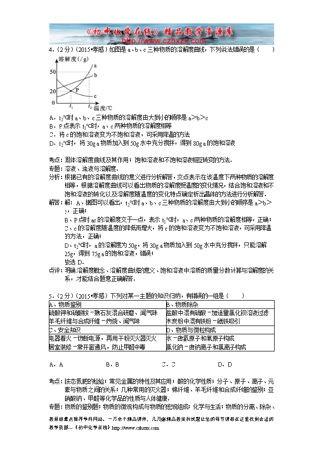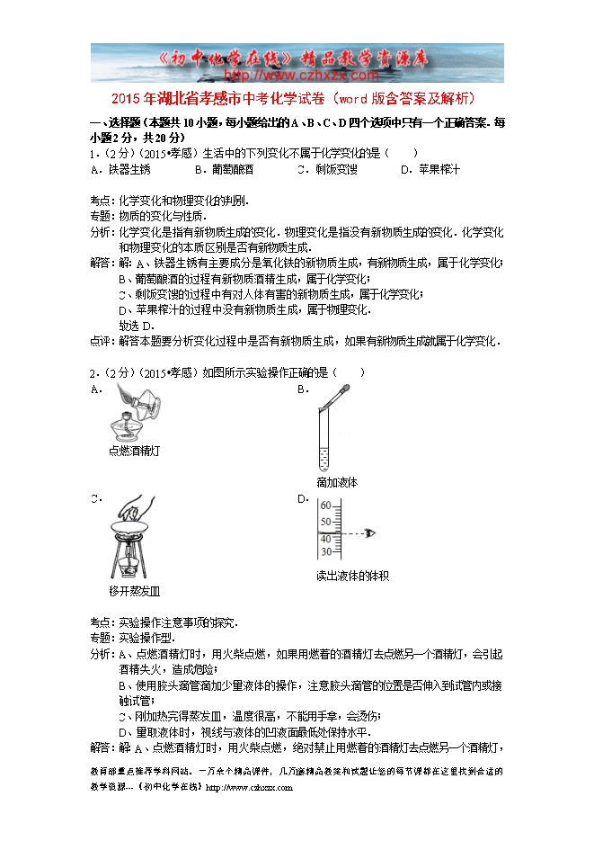 2015年湖北省孝感市中考化学试卷(word版含答案及解析)
