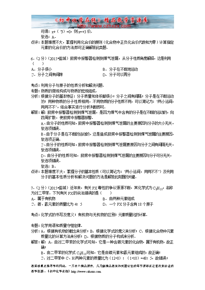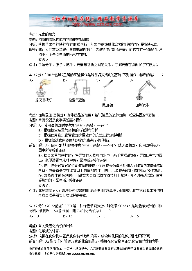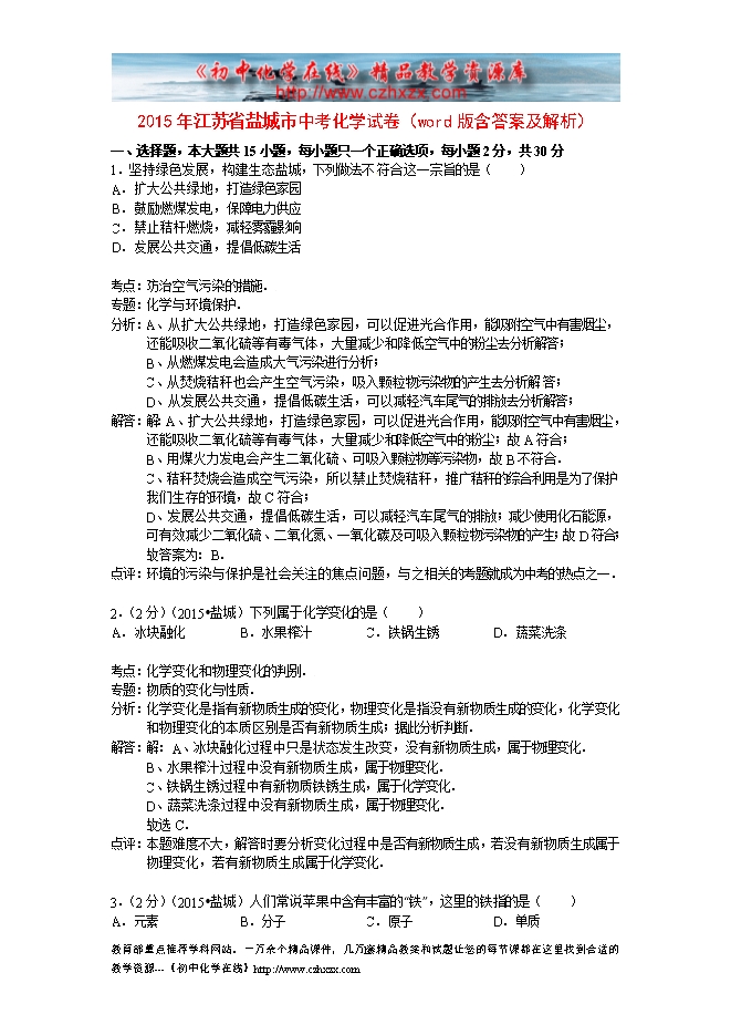2015年江苏省盐城市中考化学试卷(word版含答案及解析)