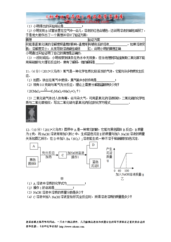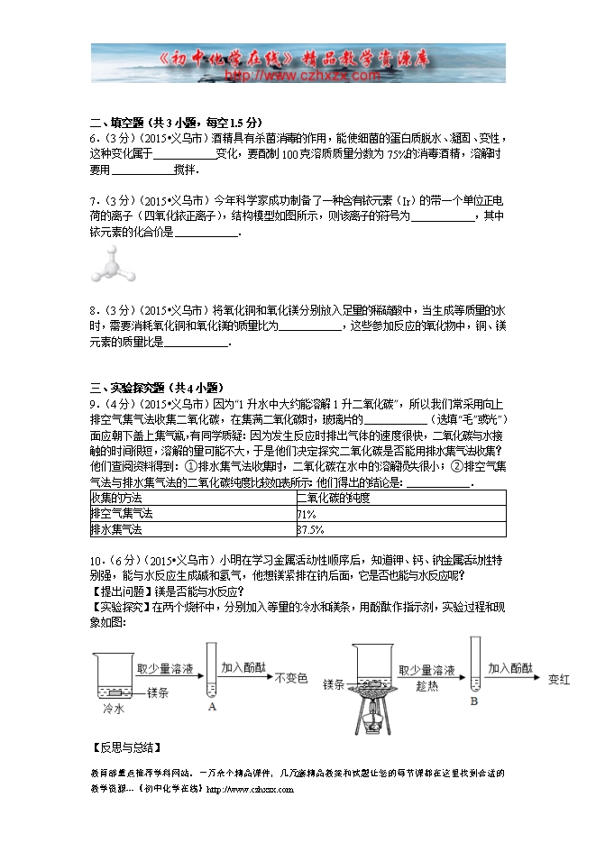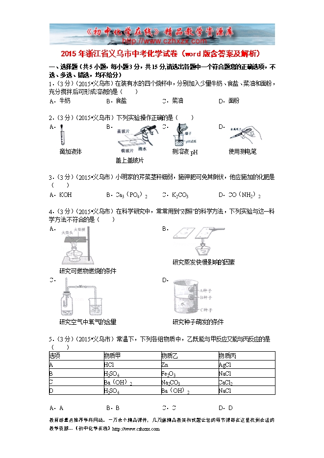 2015年浙江省义乌市中考化学试卷(word版含答案及解析)