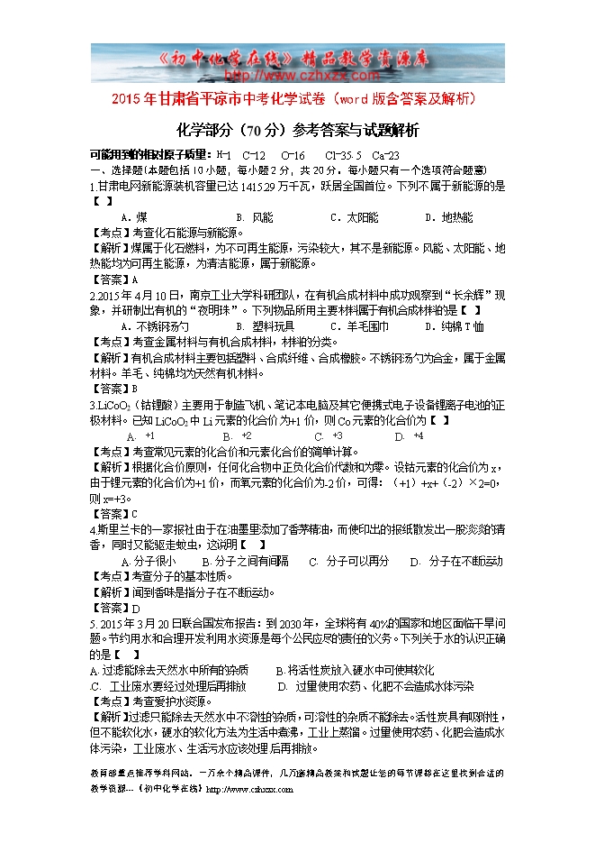 2015年甘肃省平凉市中考化学试卷(word版含答案及解析)
