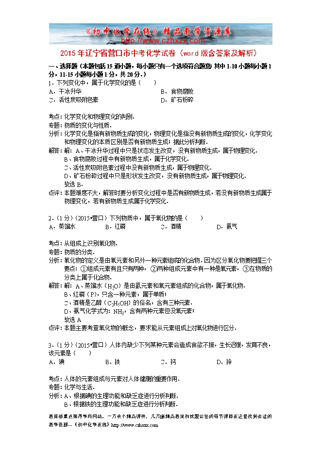 2015年辽宁省营口市中考化学试卷(word版含答案及解析)