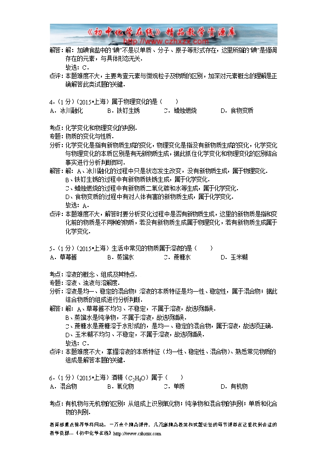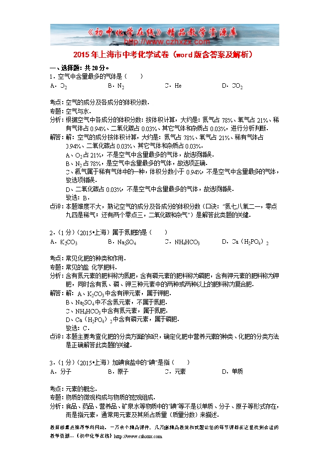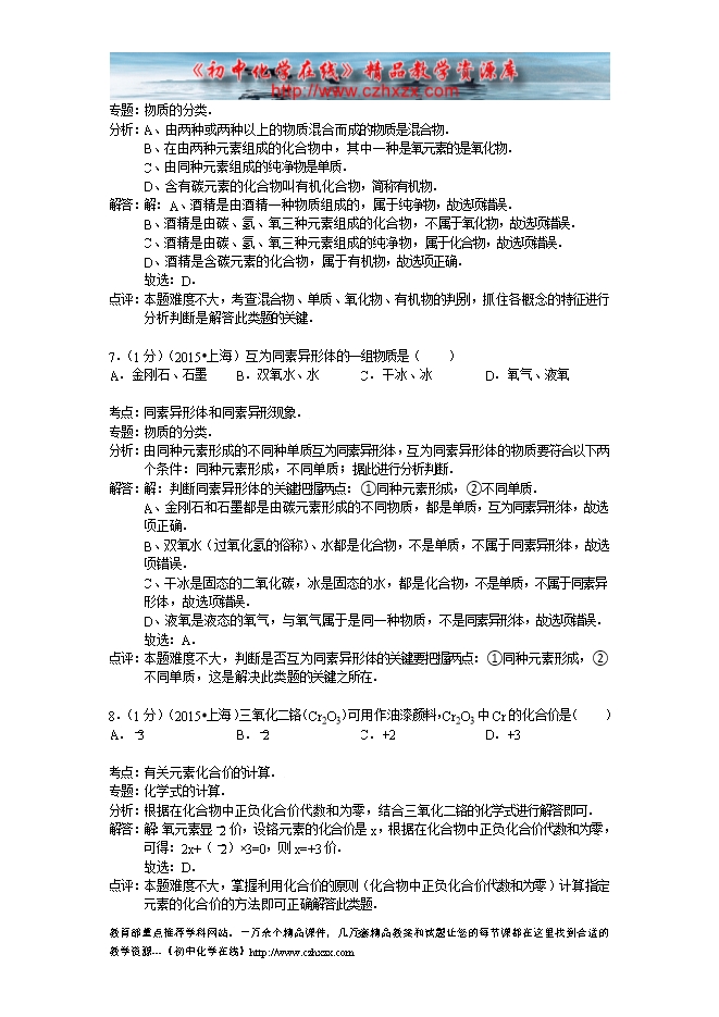 2015年上海市中考化学试卷(word版含答案及解析)
