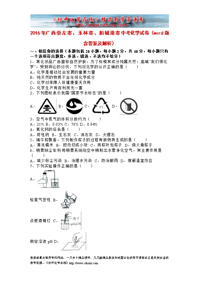 2016年广西崇左市、玉林市、防城港市中考化学试卷(word版含答案及解析)