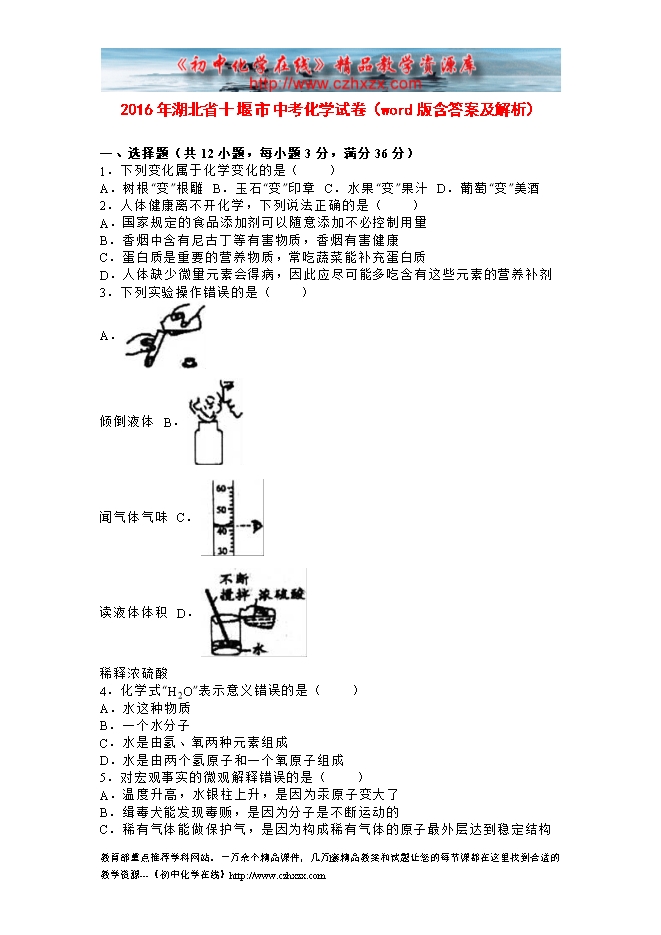 2016年湖北省十堰市中考化学试卷(word版含答案及解析)