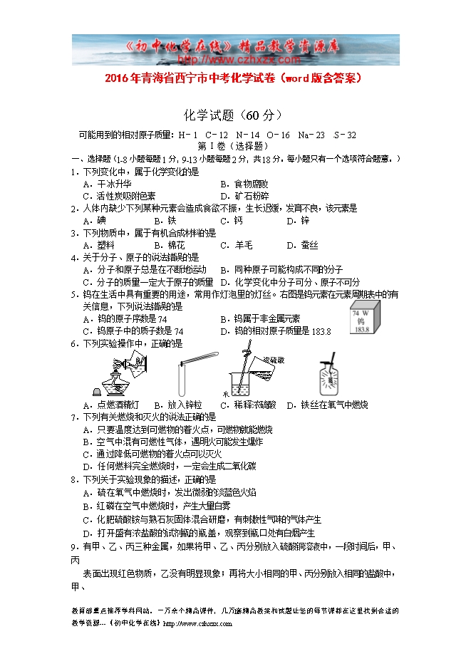 2016年青海省西宁市中考化学试卷(word版含答案)