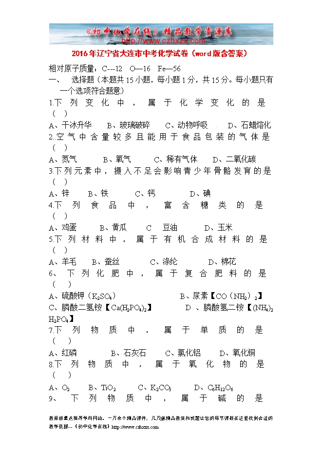 2016年辽宁省大连市中考化学试卷(word版含答案)