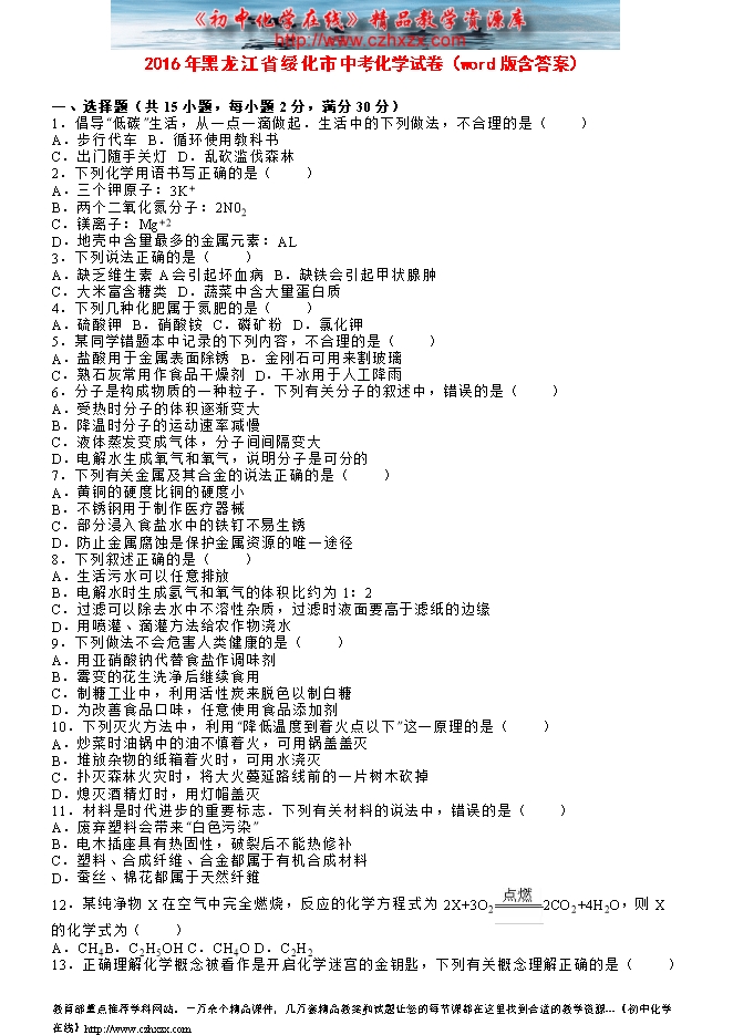 2016年黑龙江省绥化市中考化学试卷(word版含答案)