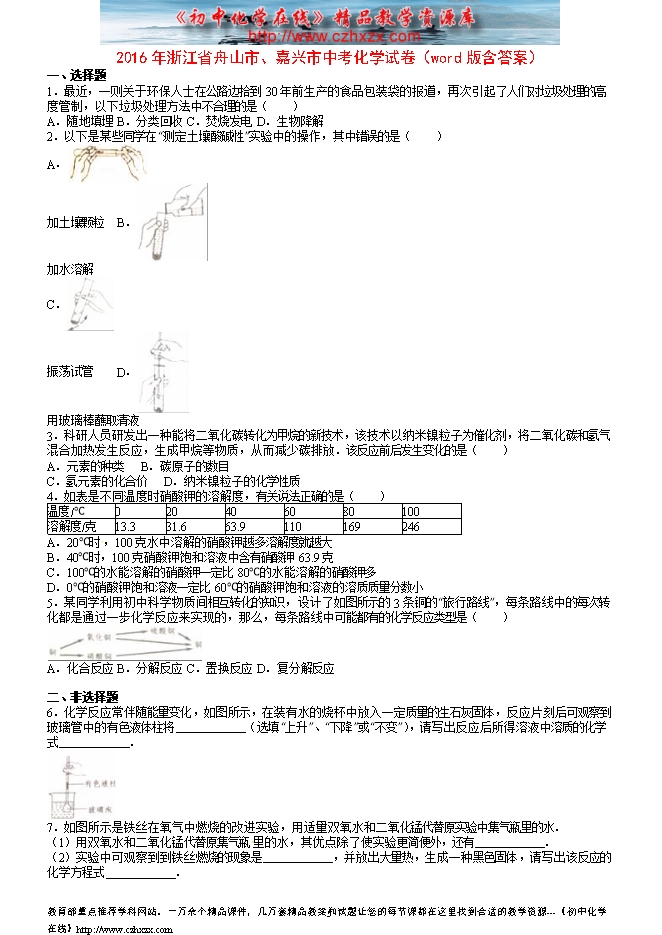 2016年浙江省舟山市、嘉兴市中考化学试卷(word版含答案)