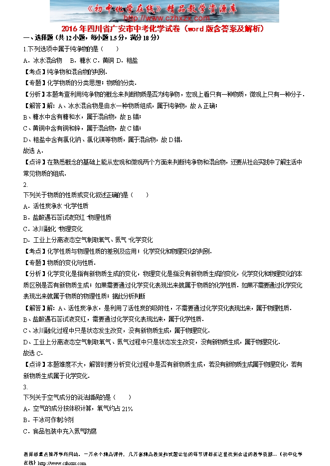 2016年四川省广安市中考化学试卷(word版含答案及解析)