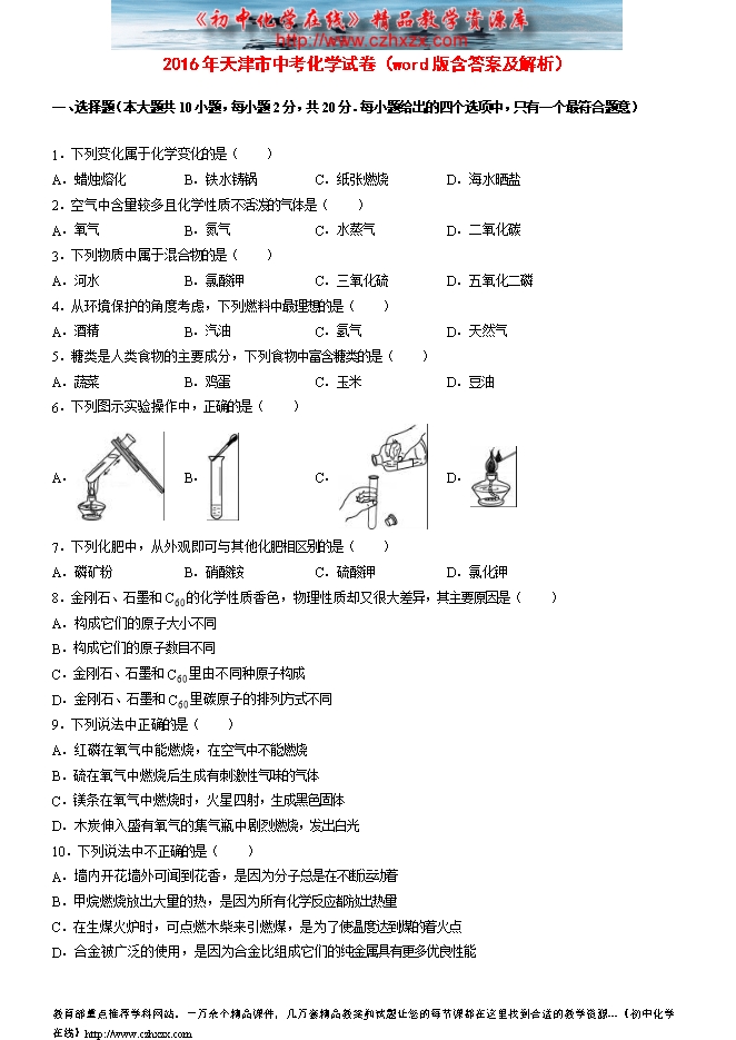 2016年天津市中考化学试卷(word版含答案及解析)