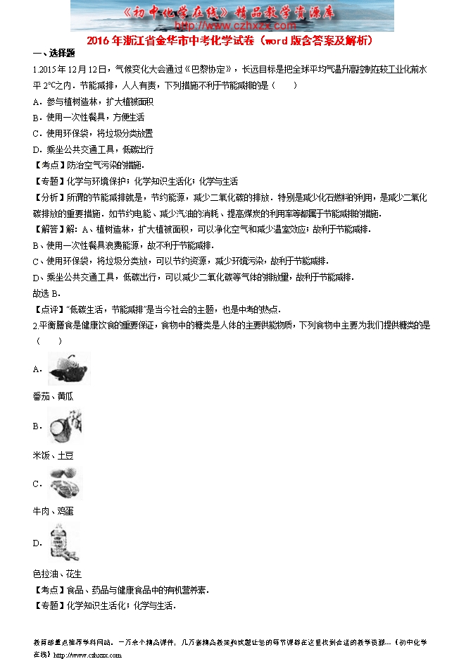 2016年浙江省金华市中考化学试卷(word版含答案及解析)