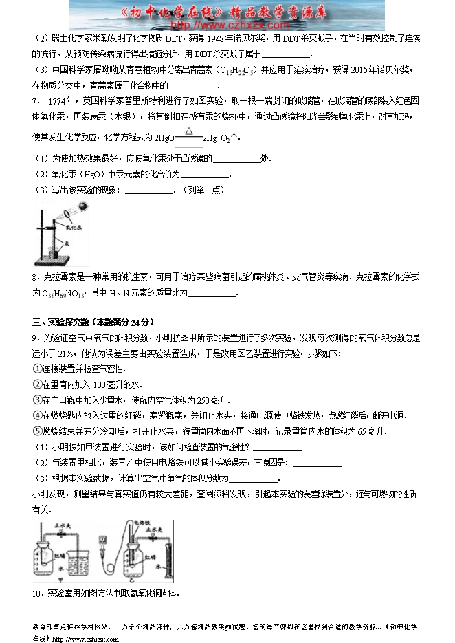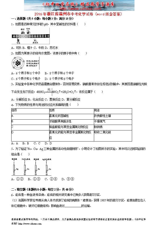 2016年浙江省温州市中考化学试卷(word版含答案)
