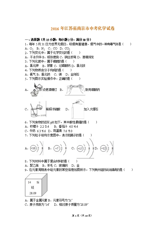 2016年江苏省南京市中考化学试卷(word版含答案)