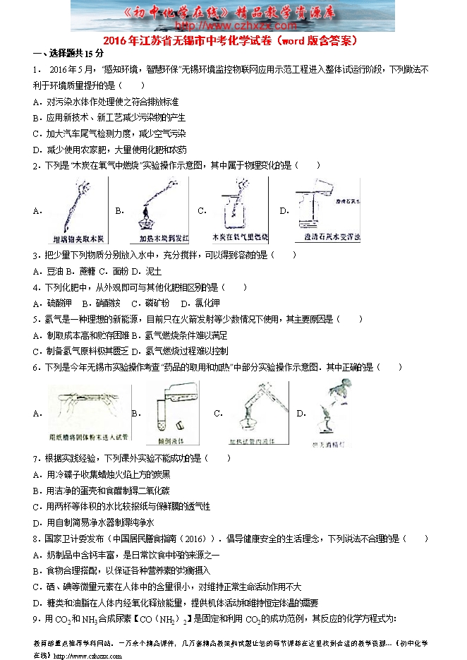2016年江苏省无锡市中考化学试卷(word版含答案)