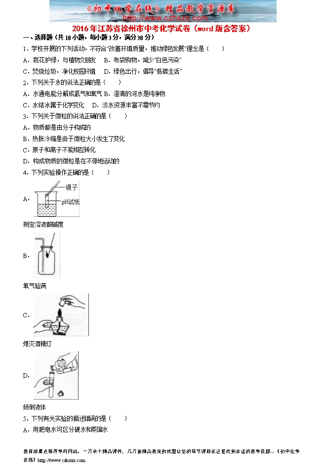 2016年江苏省徐州市中考化学试卷(word版含答案)