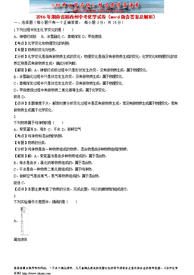 2016年湖南省湘西州中考化学试卷(word版含答案及解析)
