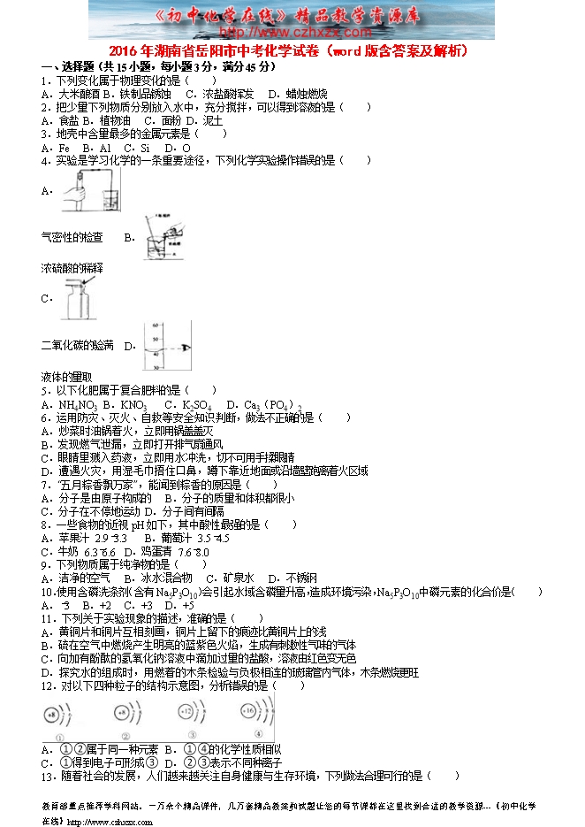 2016年湖南省岳阳市中考化学试卷(word版含答案及解析)
