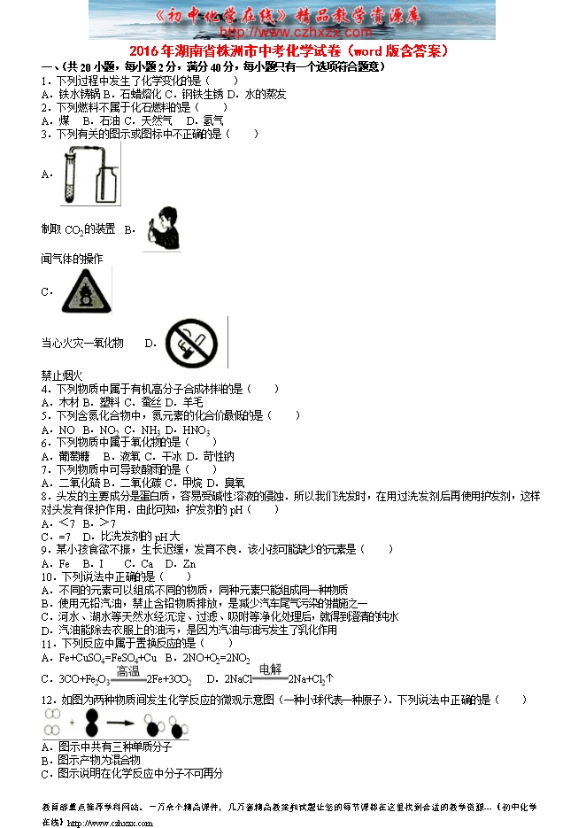 2016年湖南省株洲市中考化学试卷(word版含答案)