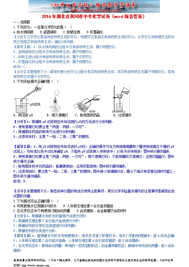 2016年湖北省黄冈市中考化学试卷(word版含答案)