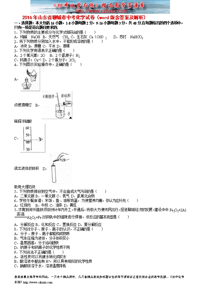 2016年山东省聊城市中考化学试卷(word版含答案及解析)