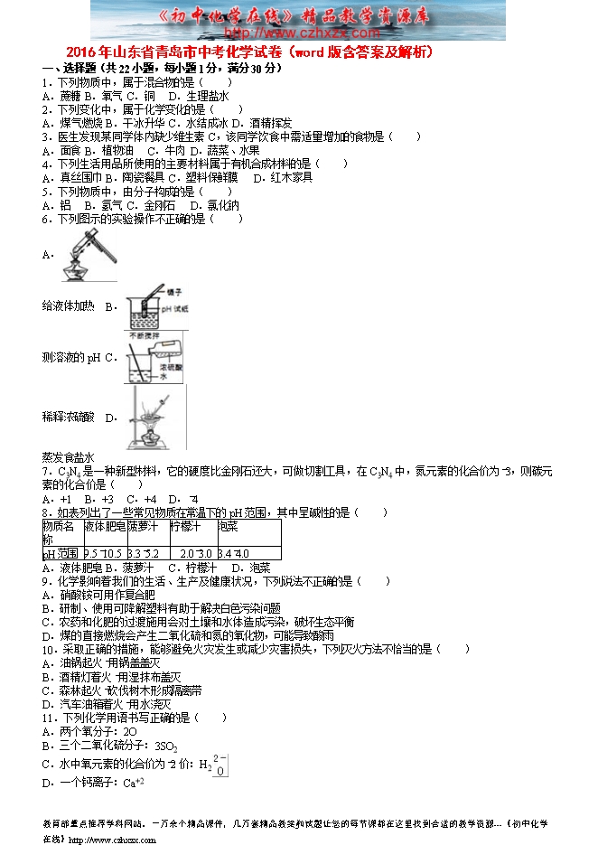 2016年山东省青岛市中考化学试卷(word版含答案及解析)