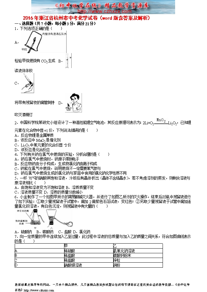 2016年浙江省杭州市中考化学试卷(word版含答案及解析)