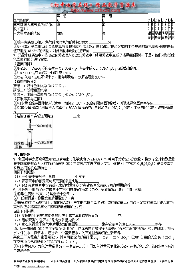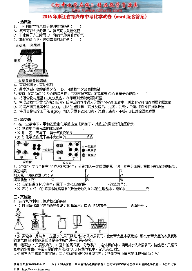 2016年浙江省绍兴市中考化学试卷(word版含答案)