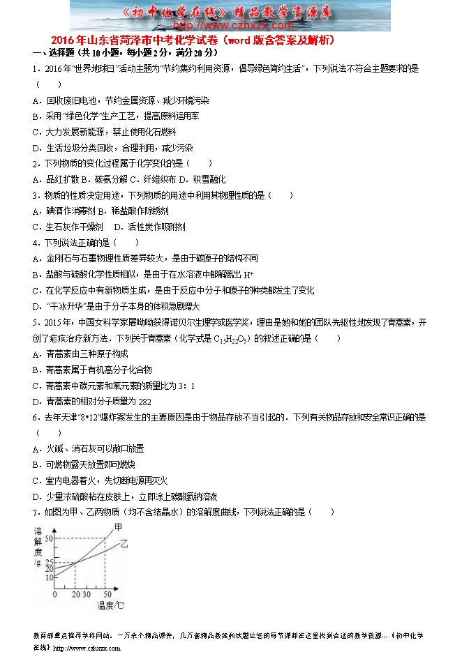 2016年山东省菏泽市中考化学试卷(word版含答案及解析)