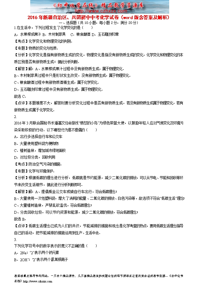 2016年新疆自治区、兵团初中中考化学试卷(word版含答案及解析)