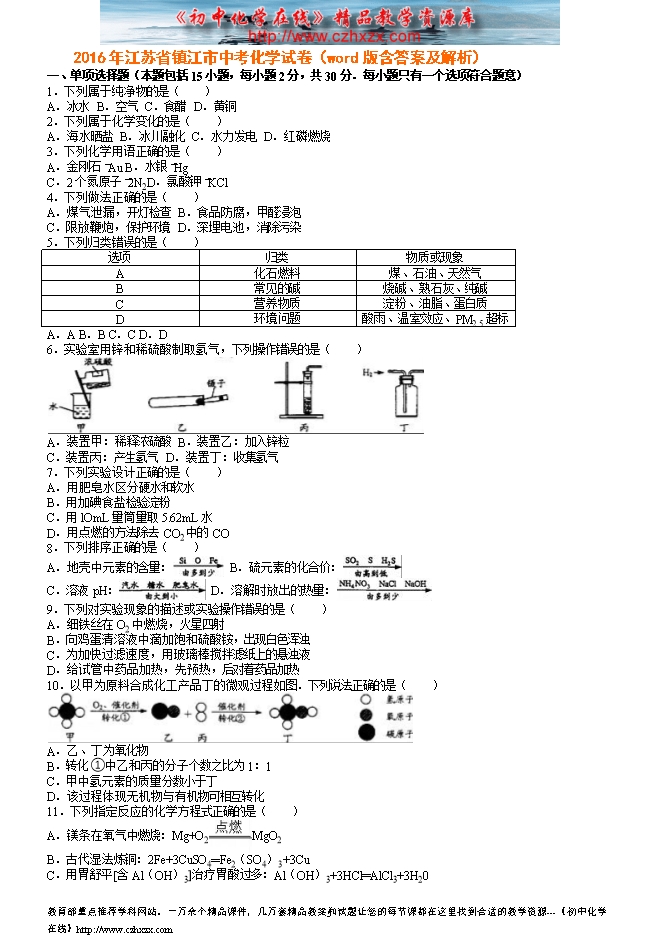 2016年江苏省镇江市中考化学试卷(word版含答案及解析)