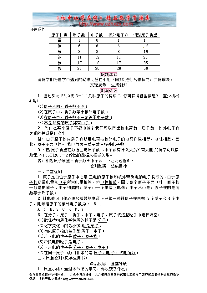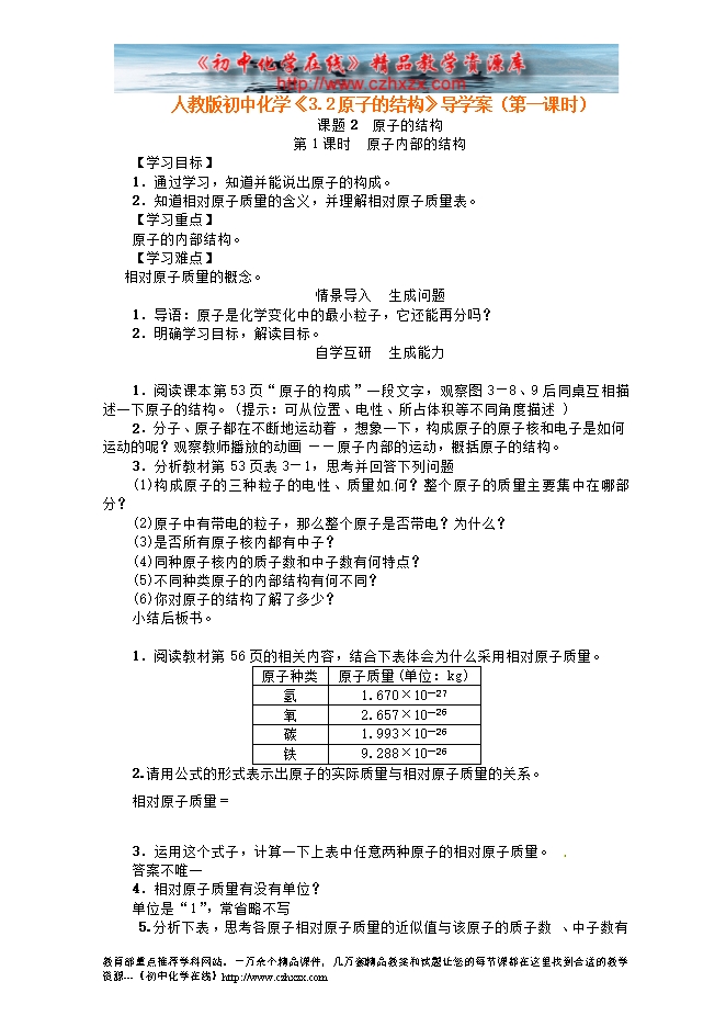 人教版初中化学《3.2原子的结构》导学案(第一课时)