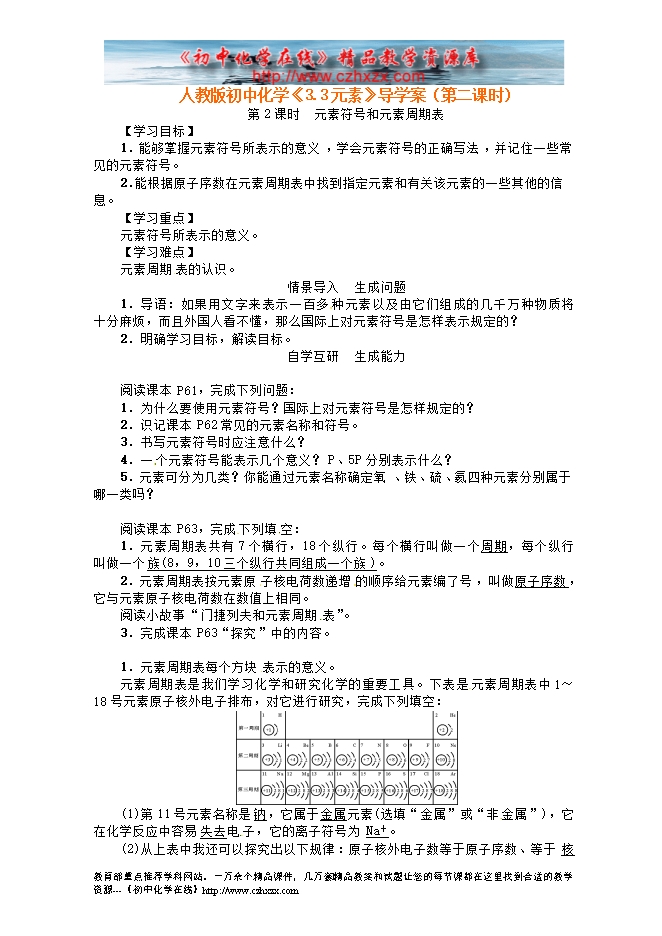 - 上一份资料:人教版初中化学《3.3元素》导学案(第一课时)