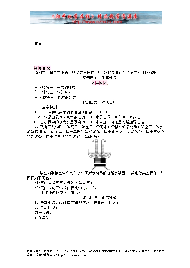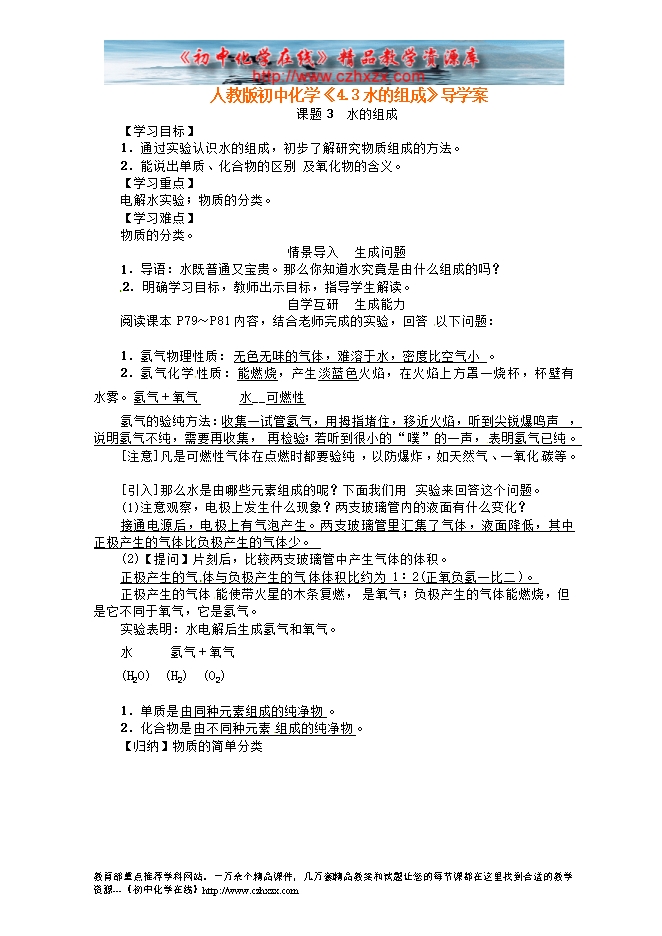 人教版初中化学《4.3水的组成》导学案