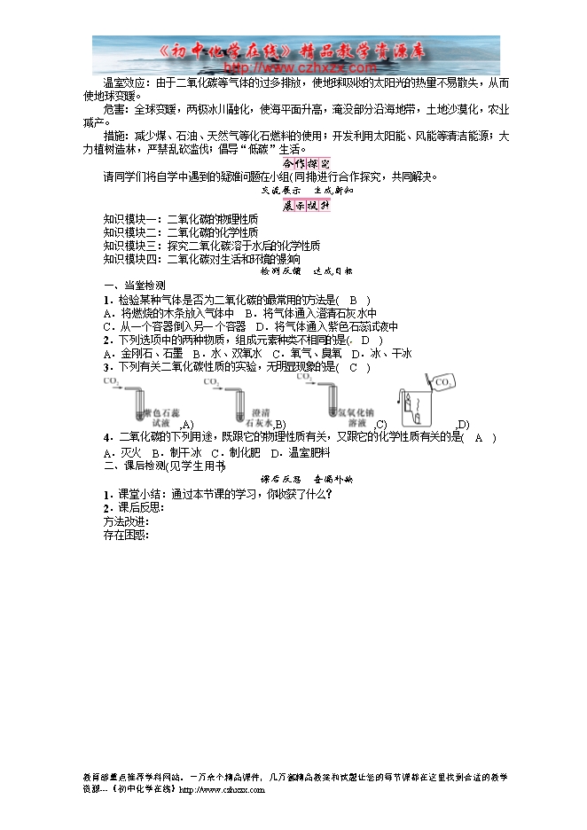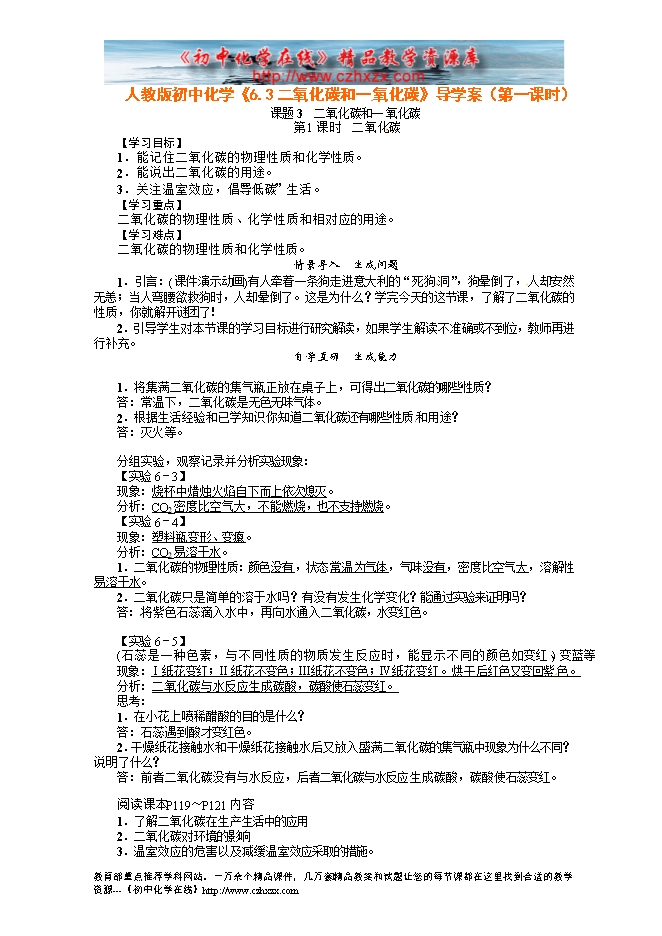 人教版初中化学《6.3二氧化碳和一氧化碳》导学案(第一课时)