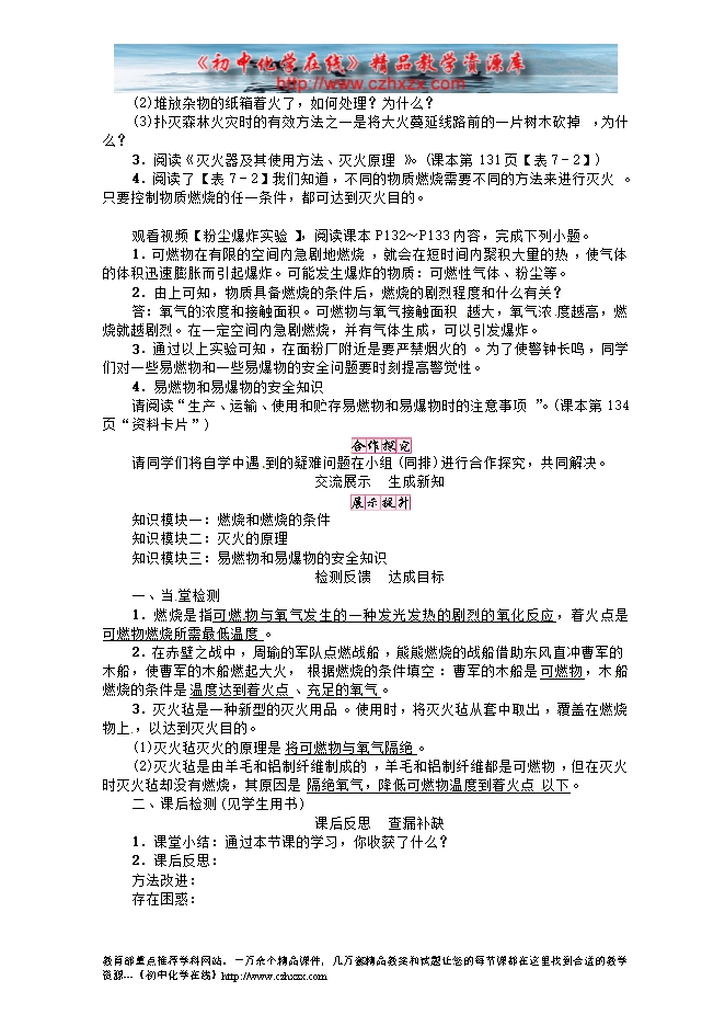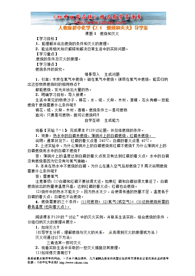 人教版初中化学《7.1燃烧和灭火》导学案