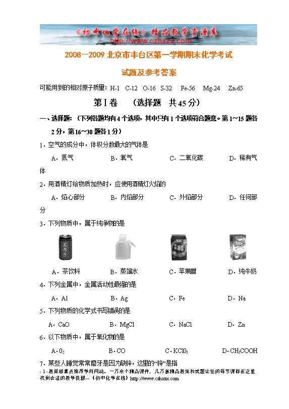 2008—2009北京市丰台区第一学期期末化学考试试题及参考答案