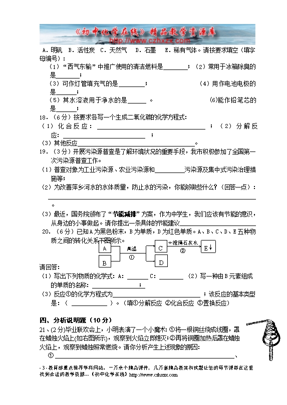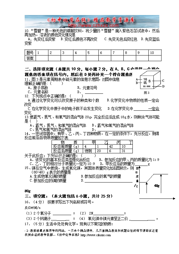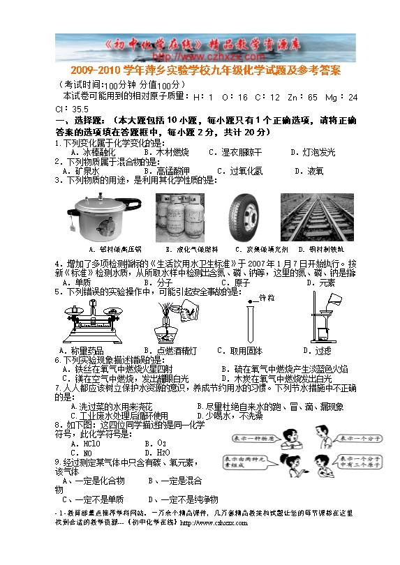 2009-2010学年萍乡实验学校第一学期化学试题及参考答案