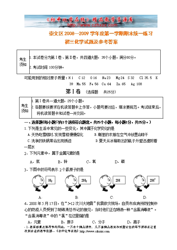 北京市崇文区2008—2009学年度第一学期期末初三化学试题及参考答案