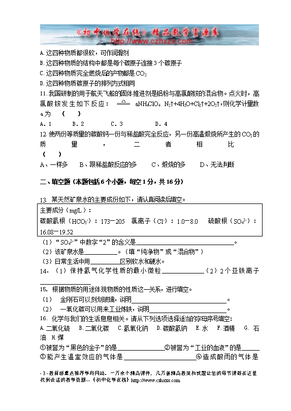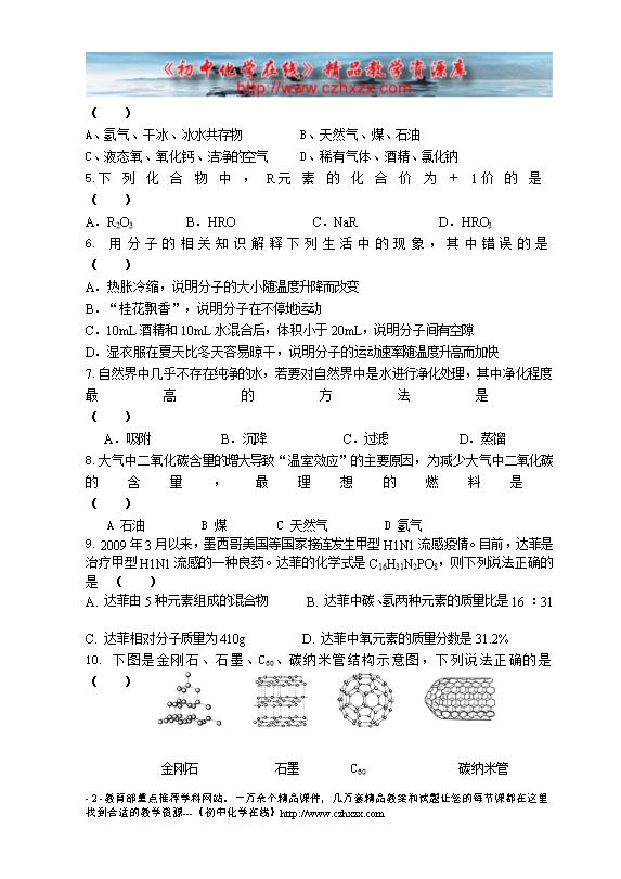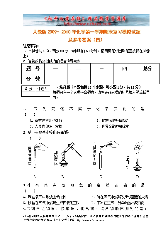 人教版2009~2010年化学第一学期期末复习模拟试题及参考答案(四)