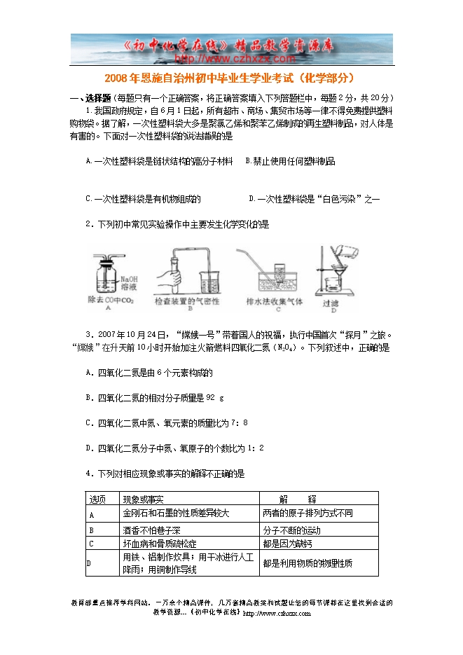 2008年湖北省恩施自治州初中毕业生学业考试及答案