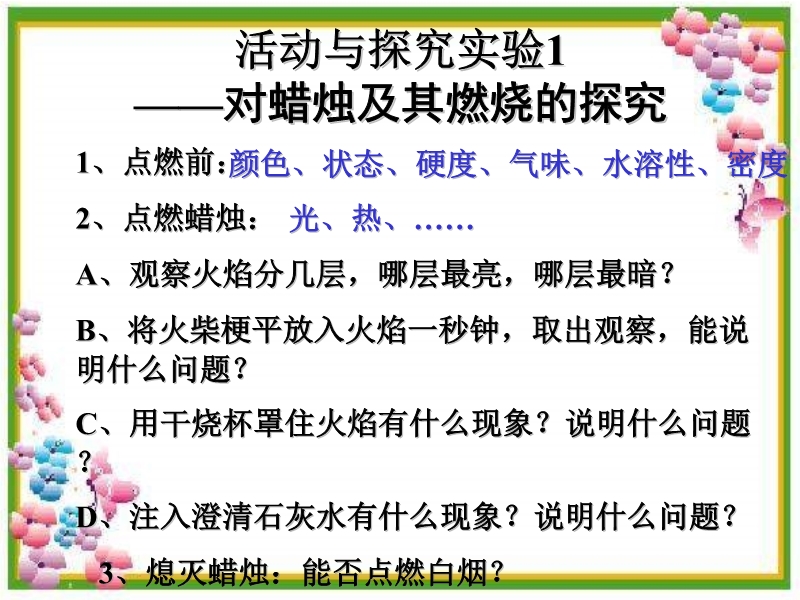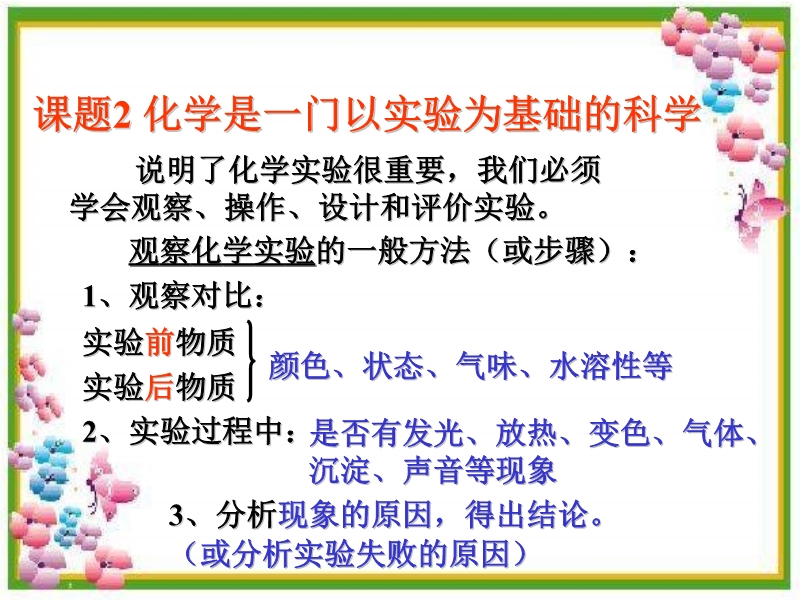 本课件是人教版第一单元《 课题2 化学是一门以实验为基础的科学》的PPt课件,由5张幻灯片组成,讲解了观察实验的方法,演示了实验探究活动。