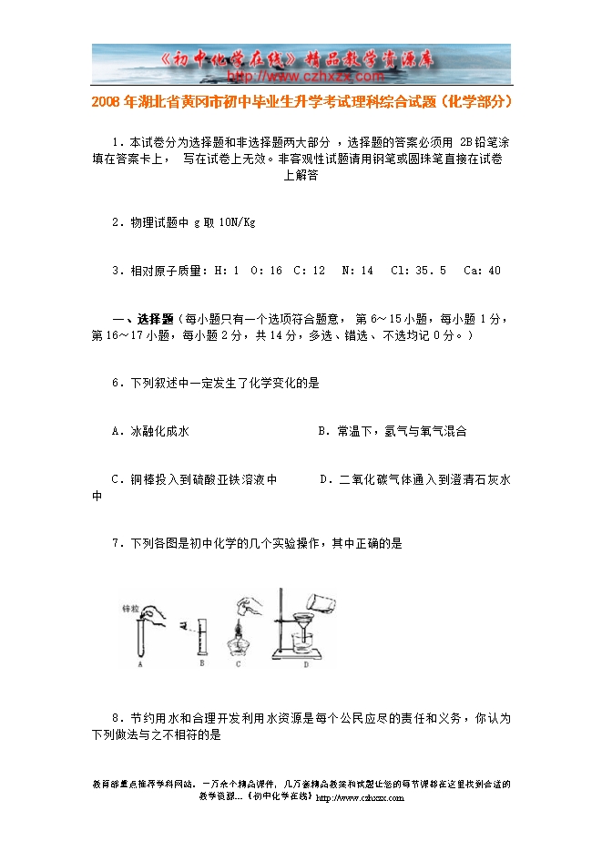 2008年湖北省黄冈市初中毕业生升学考试及答案
