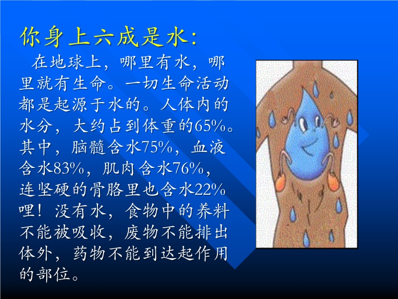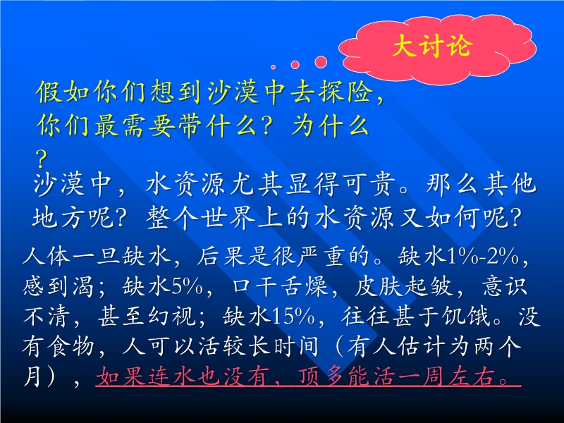 【内容简介】10本课件以人教版为基础制作,共有15张幻灯片组成,由假设去沙漠旅游设问,探究水的重要、水源污染的原因、防止水体污染、节约用水等