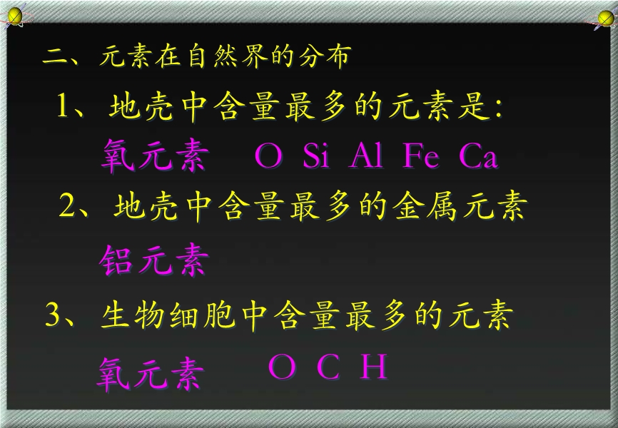 【内容简介】本课件以人教版为基础制作,共有15张幻灯片,本课件主要由思考问题入手引出课题,以文字为主讲解了元素在自然界的分布,元素种类、元素与原子的区别与联系、元素符号、元素符号的涵义、元素周期表等。并以练习加以巩固。