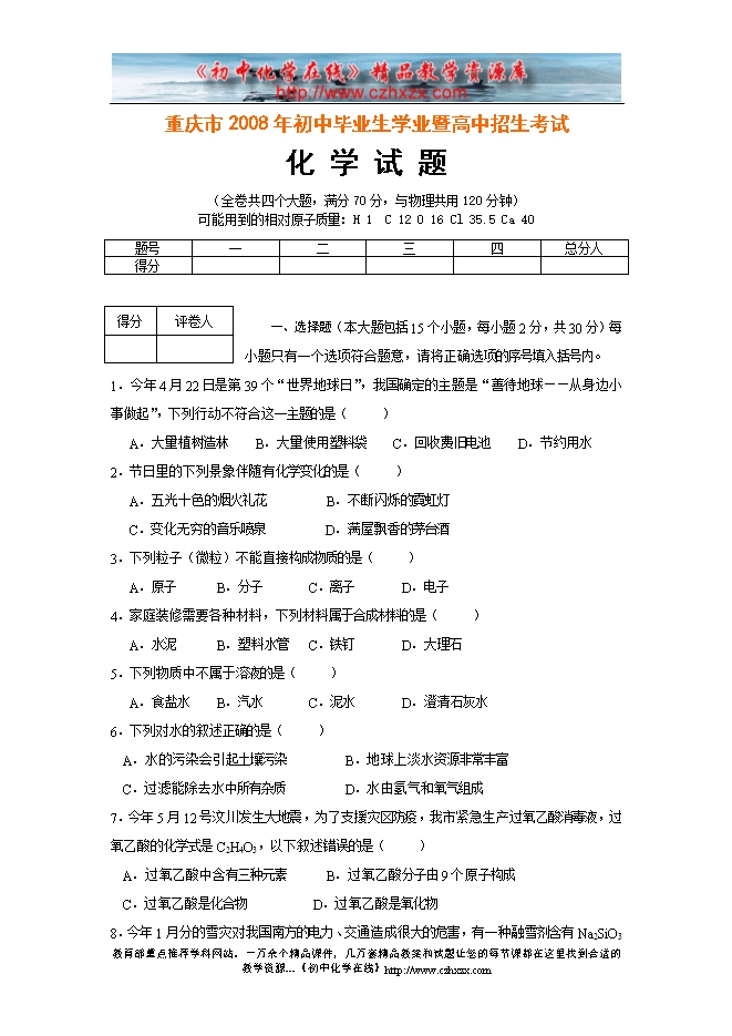 - 上一份试卷:2008年湖北省宜昌市中考化学试题及答案