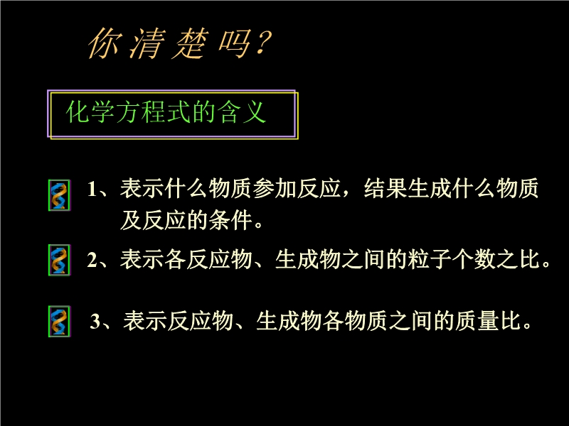 【内容简介】本课件以人教版为基础制作,共有12张幻灯片,以文字为主,探究了化学方程式的含义、以五个探究活动总结出根据化学方程式计算的正确解题步骤并讨论练习和随 堂 评 价
