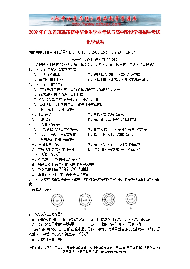 2009年广东省茂名市中考化学试题及答案